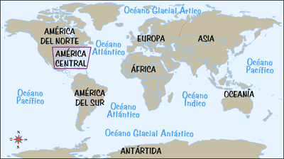 América Central limita al norte con las aguas del golfo de México, al noroeste con América del Norte, al oeste y al sur con la cuenca del océano Pacífico, al sureste con América del Sur y al este con el mar Caribe.